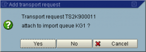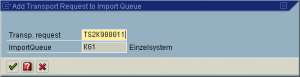 6) Continue (Enter) and confirm the following screen to add this transport to the desired import queue.