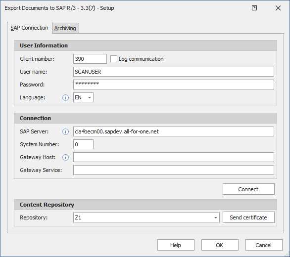 A good way to see the ERP Document Export connector in action is by trying it out with the included demo jobs. For each of the three archiving scenario’s, you’ll find a job with a pre-scanned batch. Open the Job Setup tab and press the setup button next the ERP Documents export connector to configure your SAP connection.